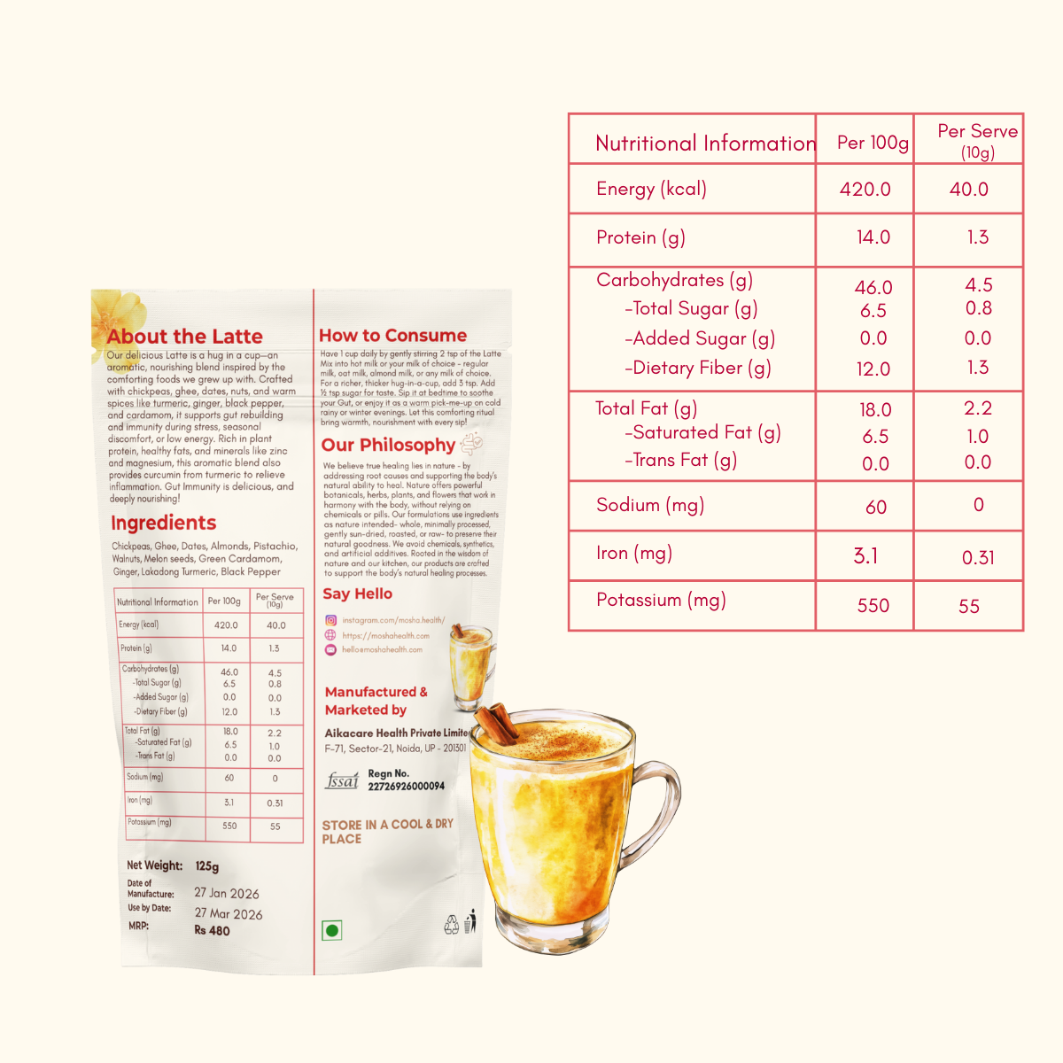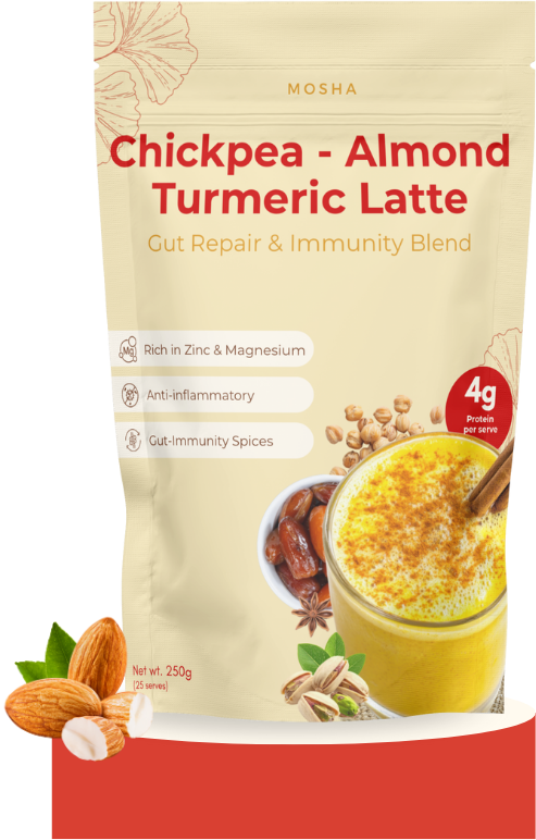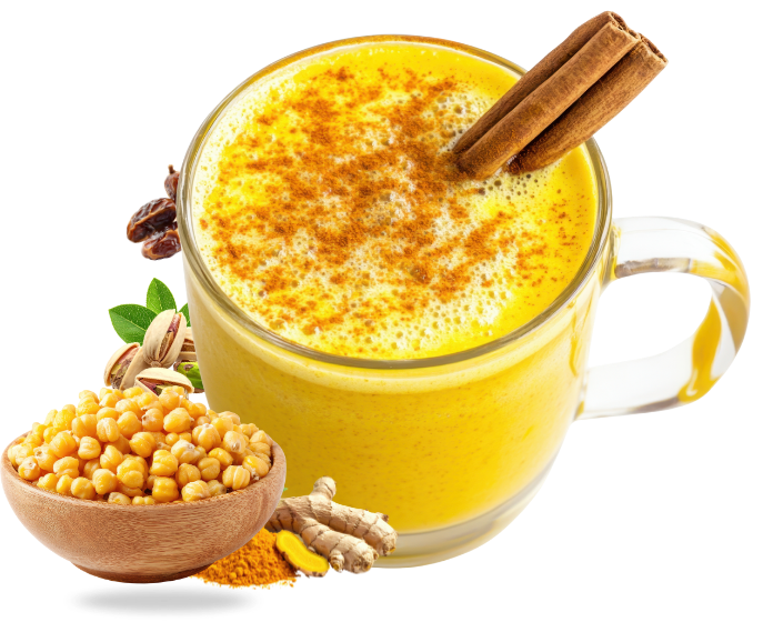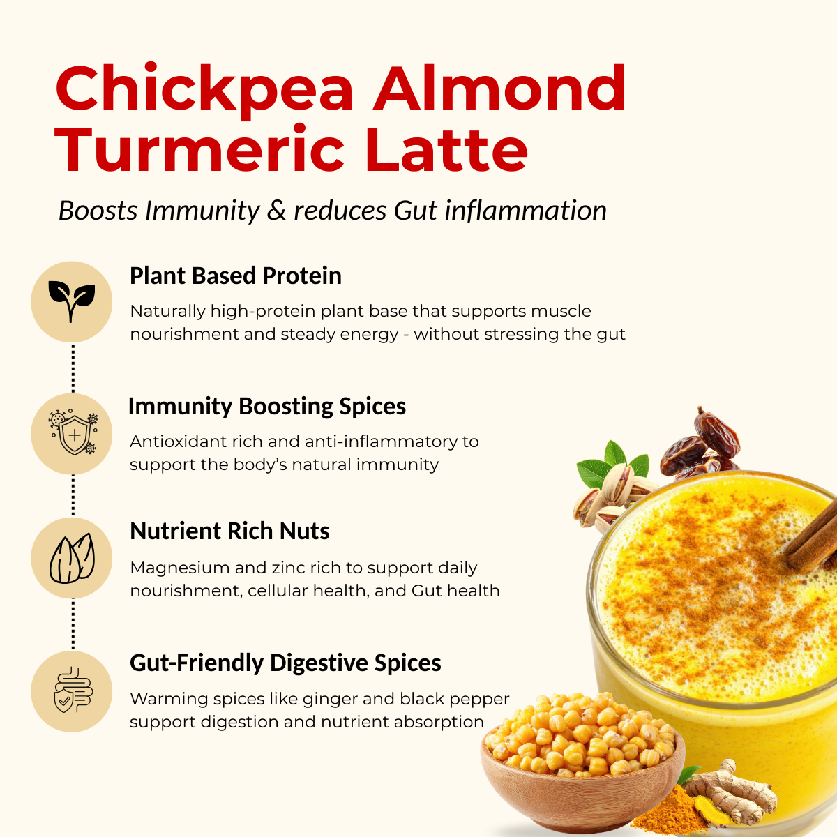 Chickpea & Almond Turmeric Latte is a warm, nourishing drink made from roasted chickpeas, nuts, ghee, dates, and commonly used kitchen spices like turmeric, ginger, and black pepper. It is meant to be taken regularly as part of a daily routine.