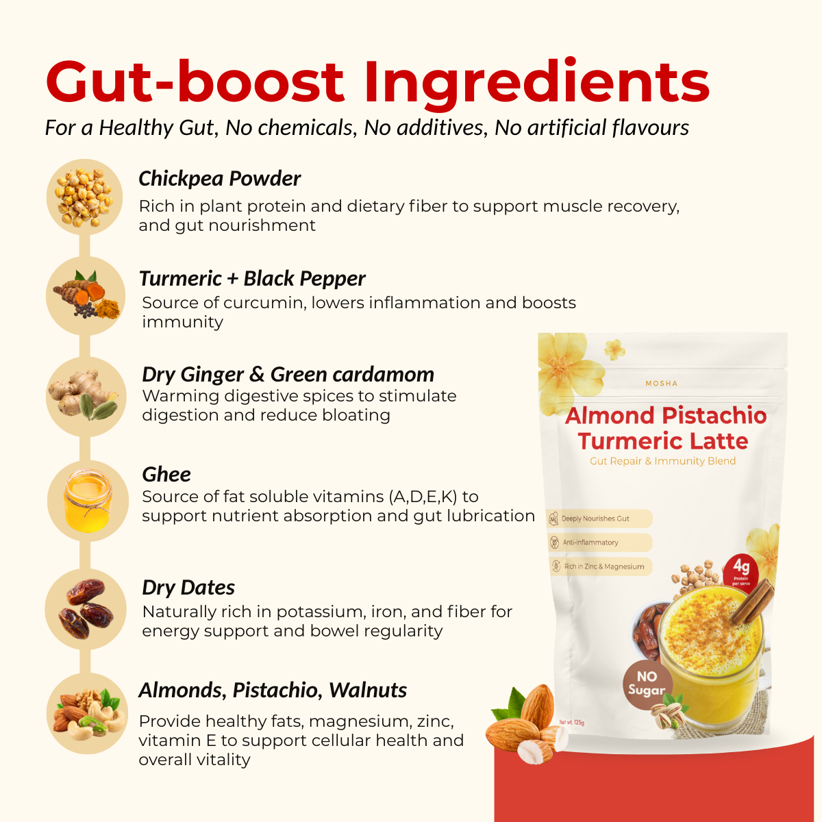 Almond Pistachio Turmeric Latte is a warm, nourishing drink made from roasted chickpeas, nuts, ghee, dates, and commonly used kitchen spices like turmeric, ginger, and black pepper. It is meant to be taken regularly as part of a daily routine.