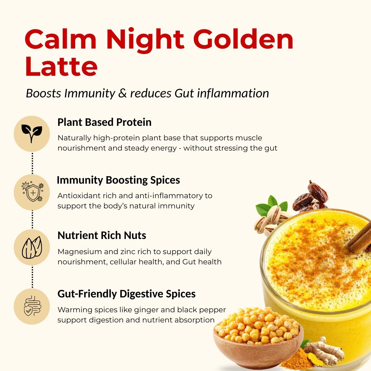 Calm Night Golden Latte is a warm, nourishing drink made from roasted chickpeas, nuts, ghee, dates, and commonly used kitchen spices like turmeric, ginger, and black pepper. It is meant to be taken regularly as part of a daily routine.