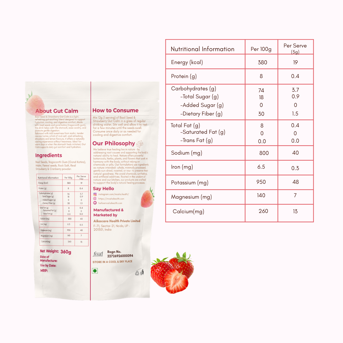 Balanced with mild sweetness from mishri, a hint of rock salt, and refreshing strawberry and Cranberry flavours, it offers a naturally cooling experience without heaviness. Ideal for warm days or when the stomach feels irritated, Gut Calm supports daily gut comfort and hydration.