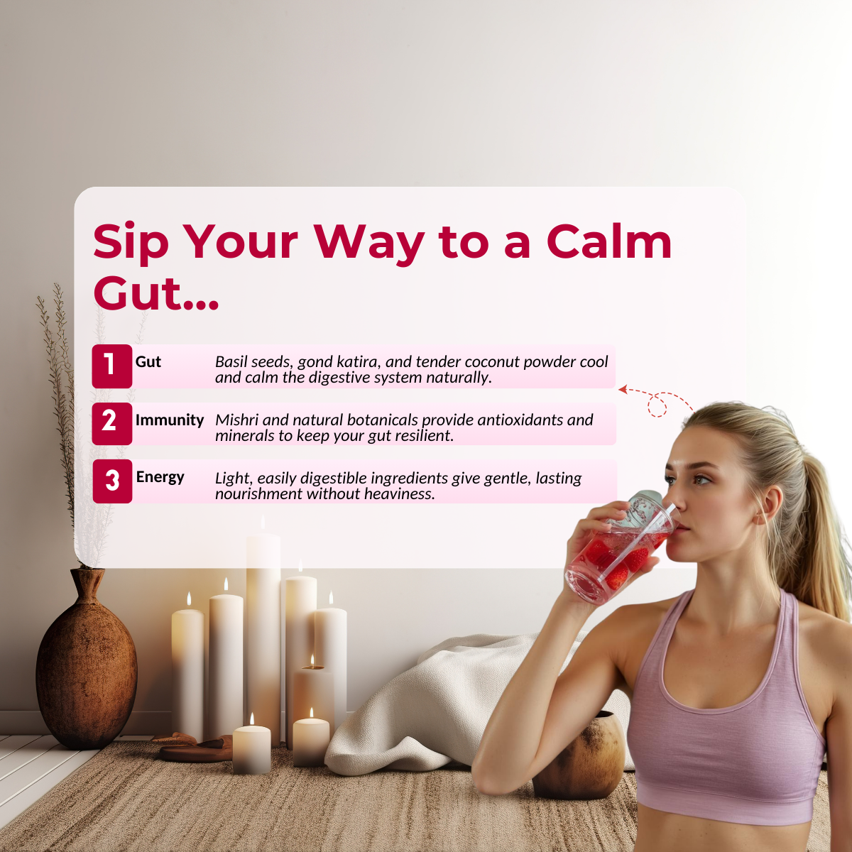 Gut Calm is a light, refreshing gut-soothing blend designed to support hydration, cooling, and digestive comfort. Made with basil seeds and gond katira , this drink helps calm the stomach, ease acidity, and promote gentle digestion.