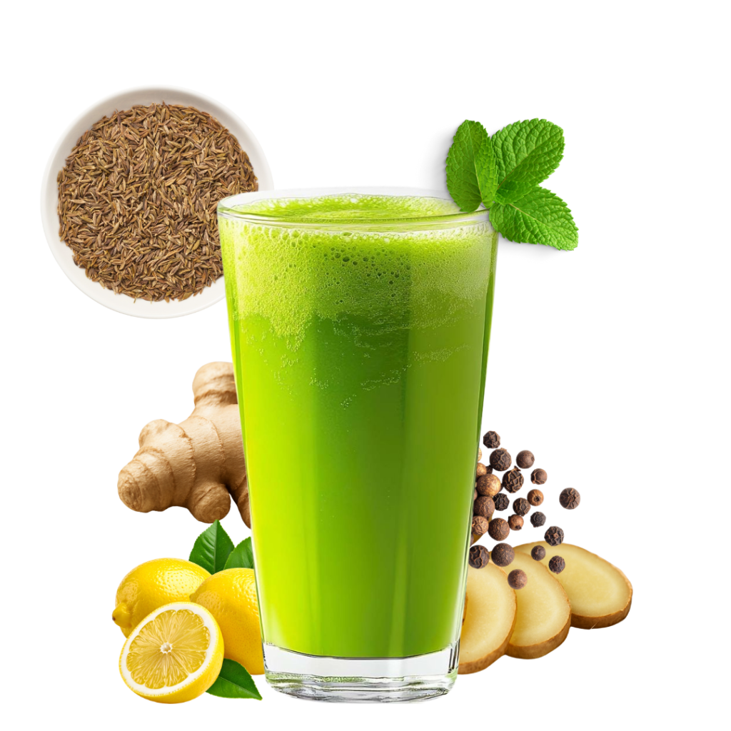 Cumin, black pepper, dry ginger, and hing work together to reduce bloating, gas, and acidity.