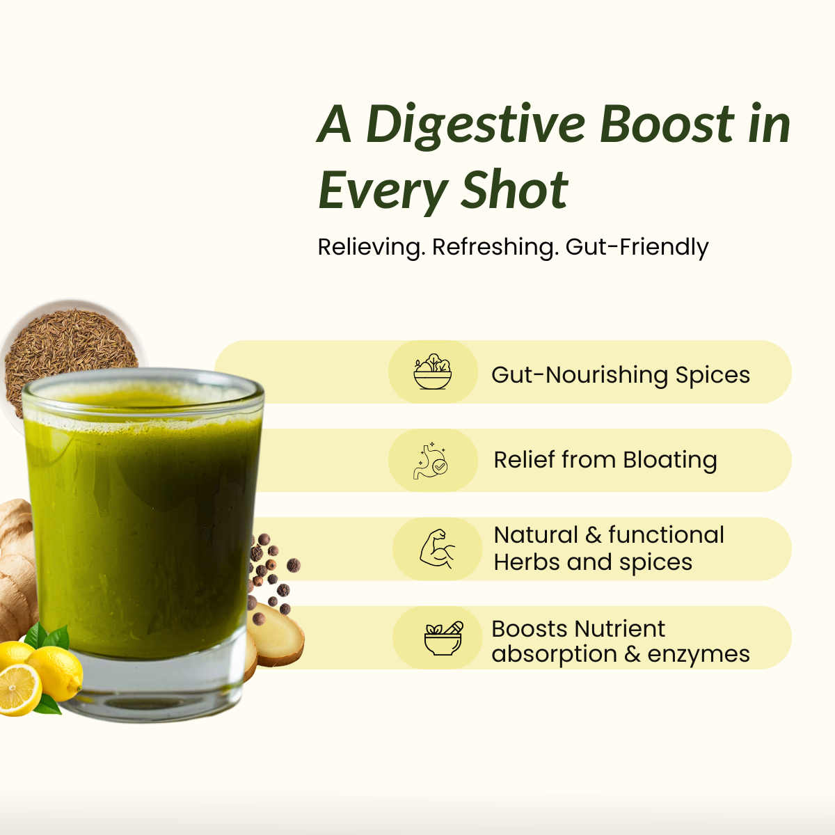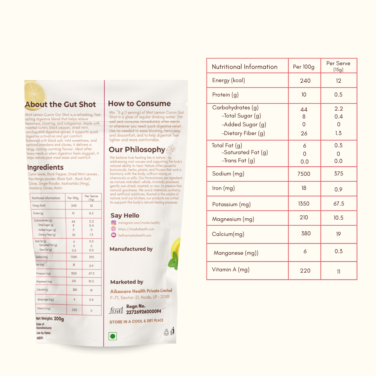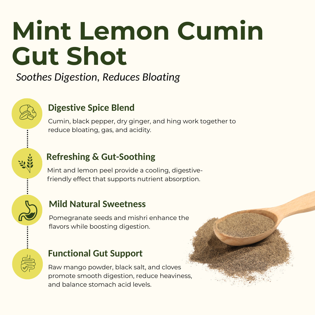 Mix 1tsp in 100 ml water and take as a quick gut shot to ease bloating, gas, and acidity.