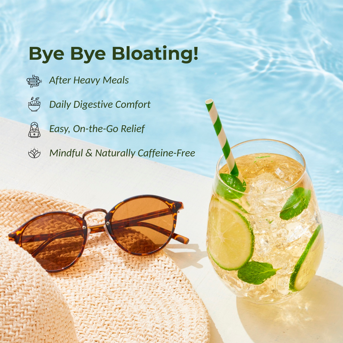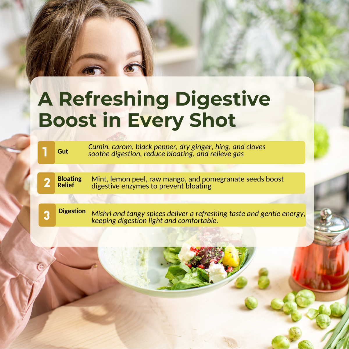 Bloating Relief - Mint, lemon peel, raw mango, and pomegranate seeds boost digestive enzymes to prevent bloating